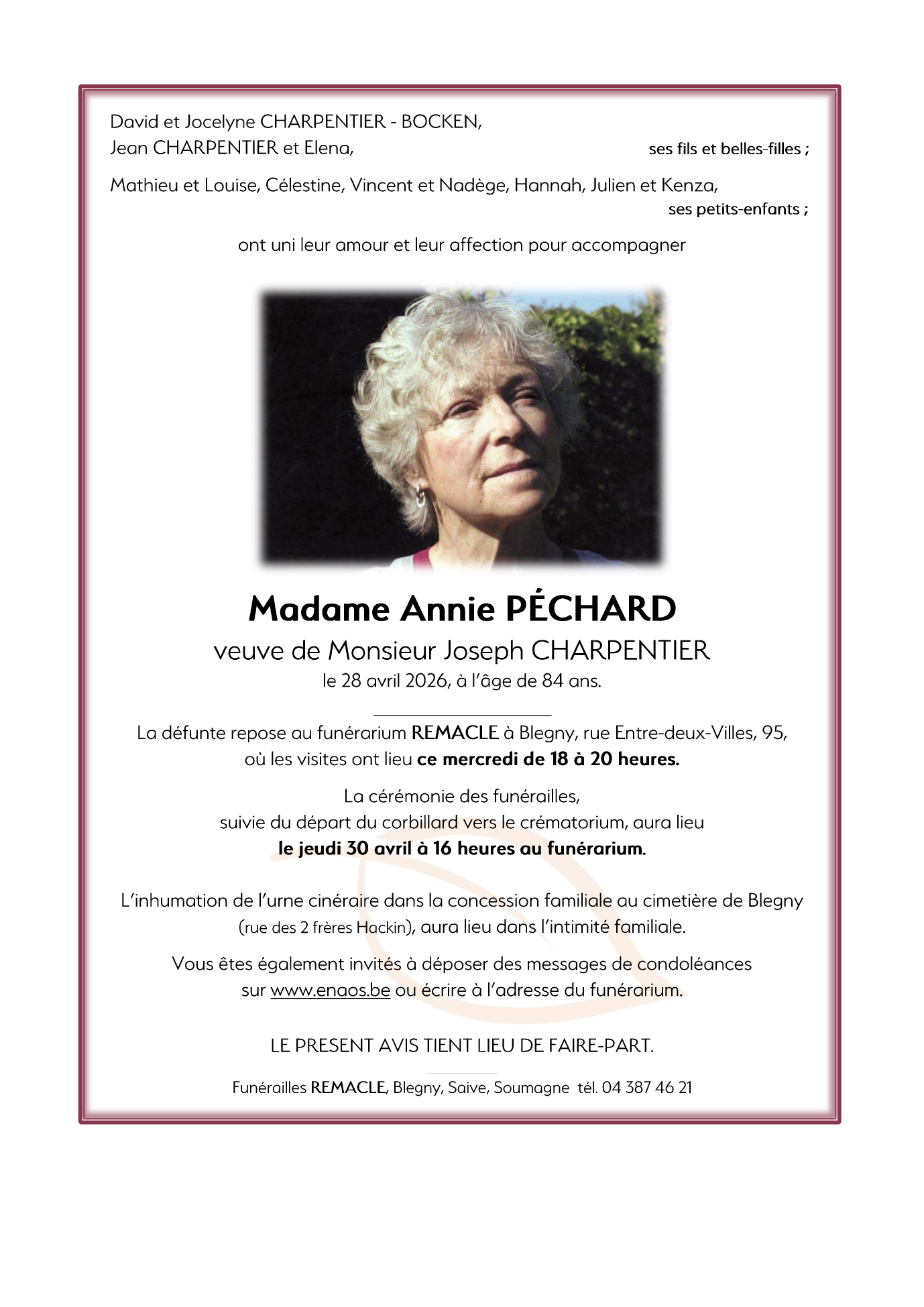 Funérailles REMACLE de Blegny le jeudi 30 avril à 16 heures