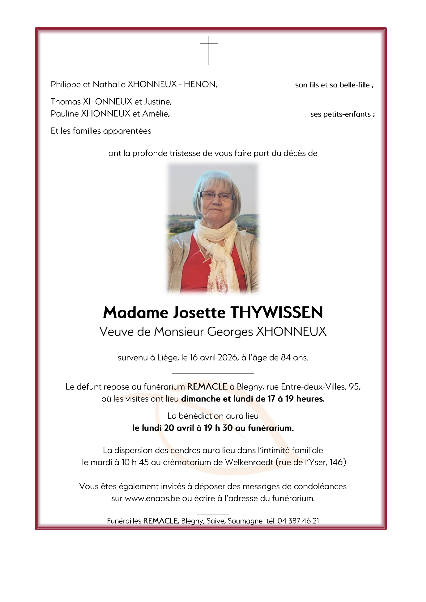 Funérailles REMACLE de Blegny le lundi 20 avril à 19 heures 30