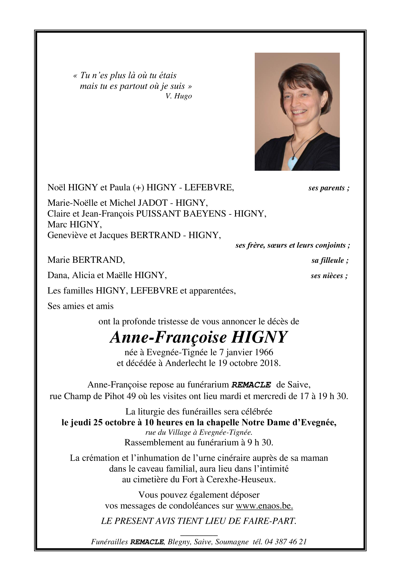 Décédée à Anderlecht (1070) le vendredi 19 octobre 2018 à l'âge de 52 ans