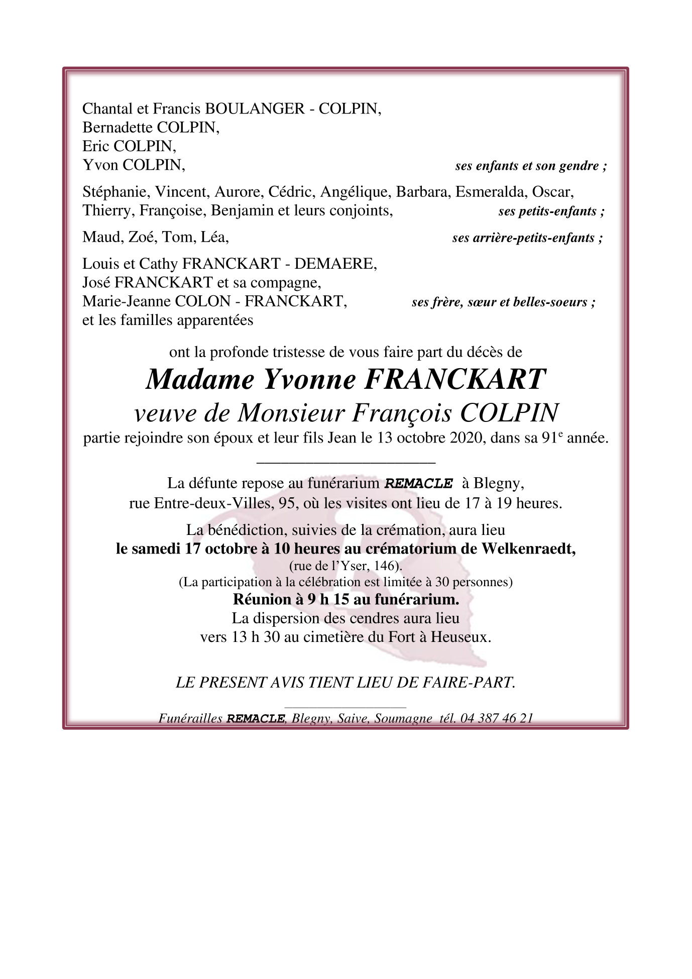 Décédée à Herstal (4040) le mardi 13 octobre 2020 à l'âge de 90 ans