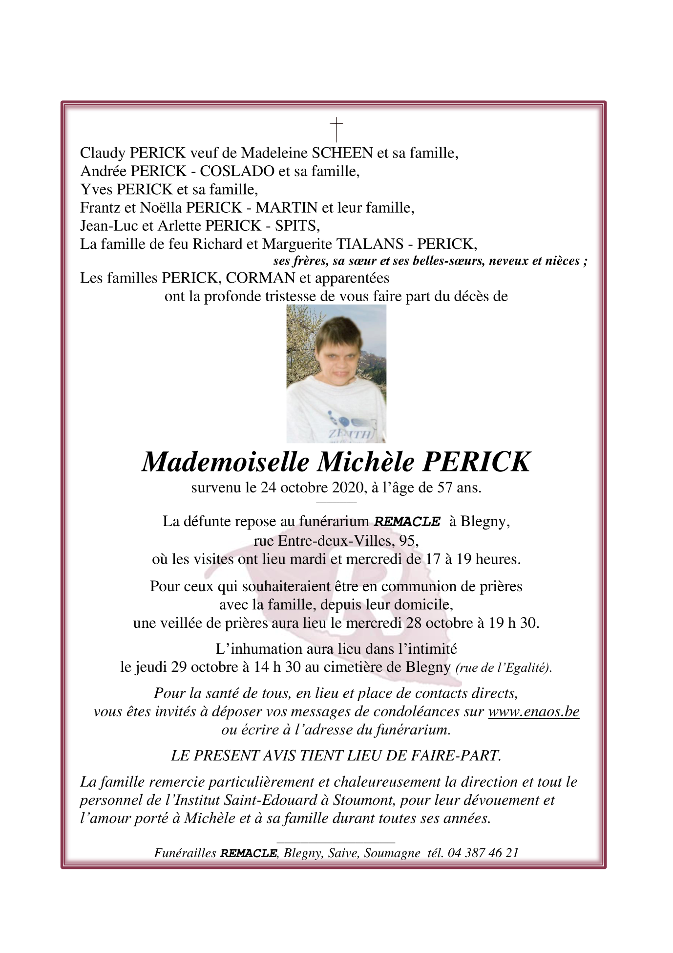 Décédée à Stoumont (4987) le samedi 24 octobre 2020 à l'âge de 57 ans