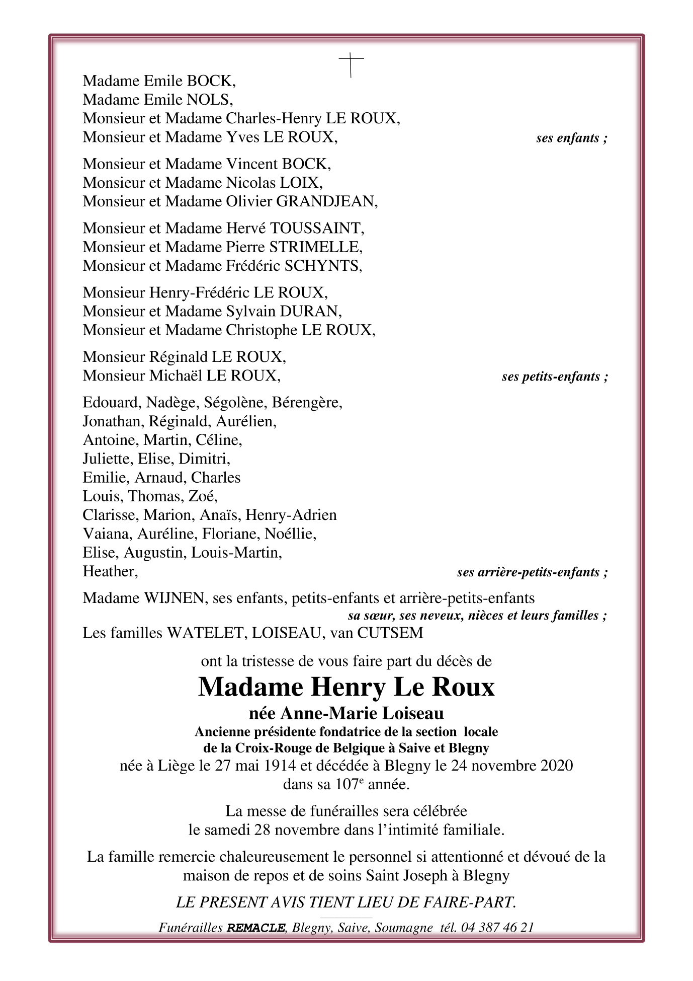 Décédée à Blegny (4670) le mardi 24 novembre 2020 à l'âge de 106 ans