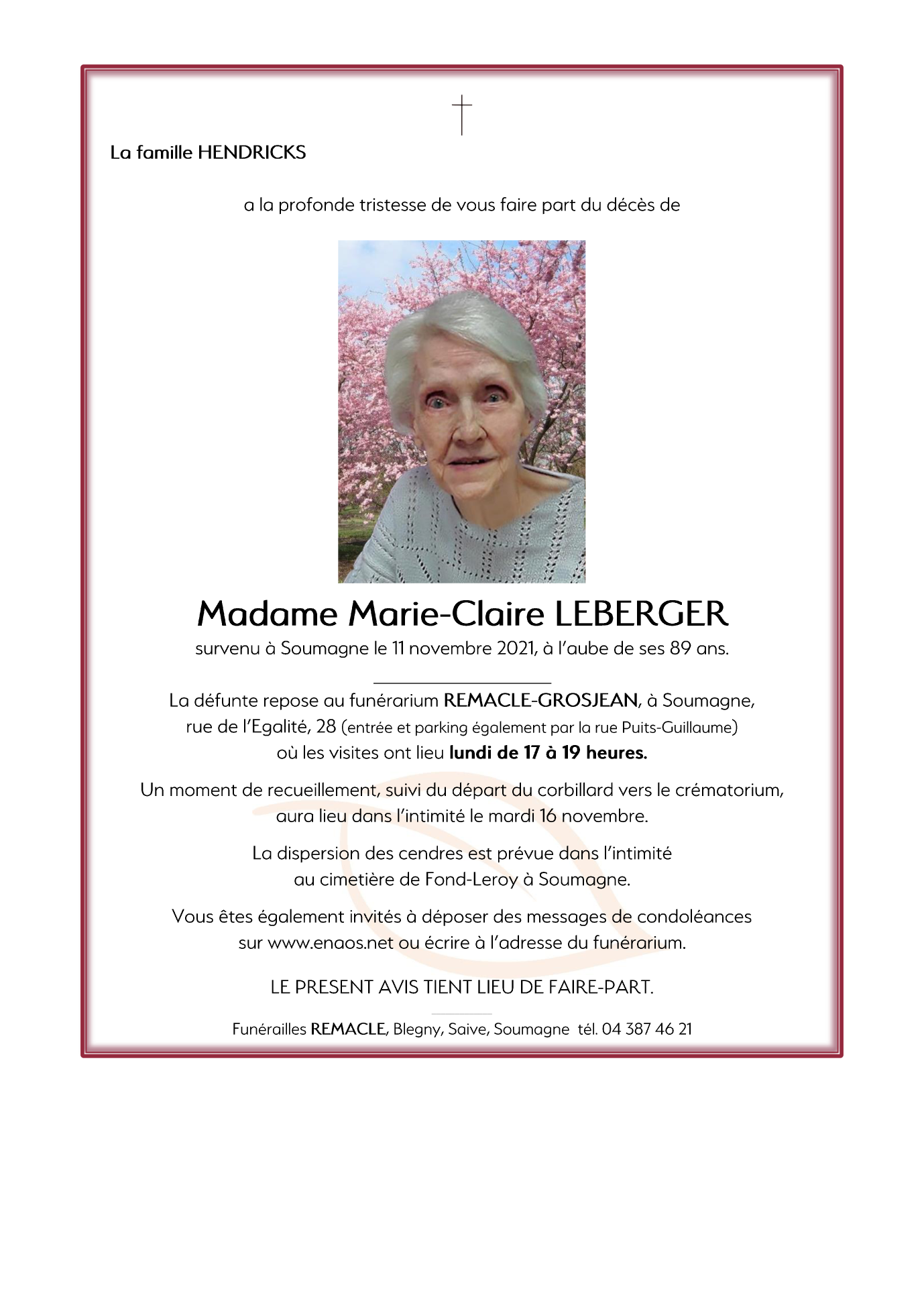 Décédée à Soumagne (4630) le jeudi 11 novembre 2021 à l'âge de 89 ans