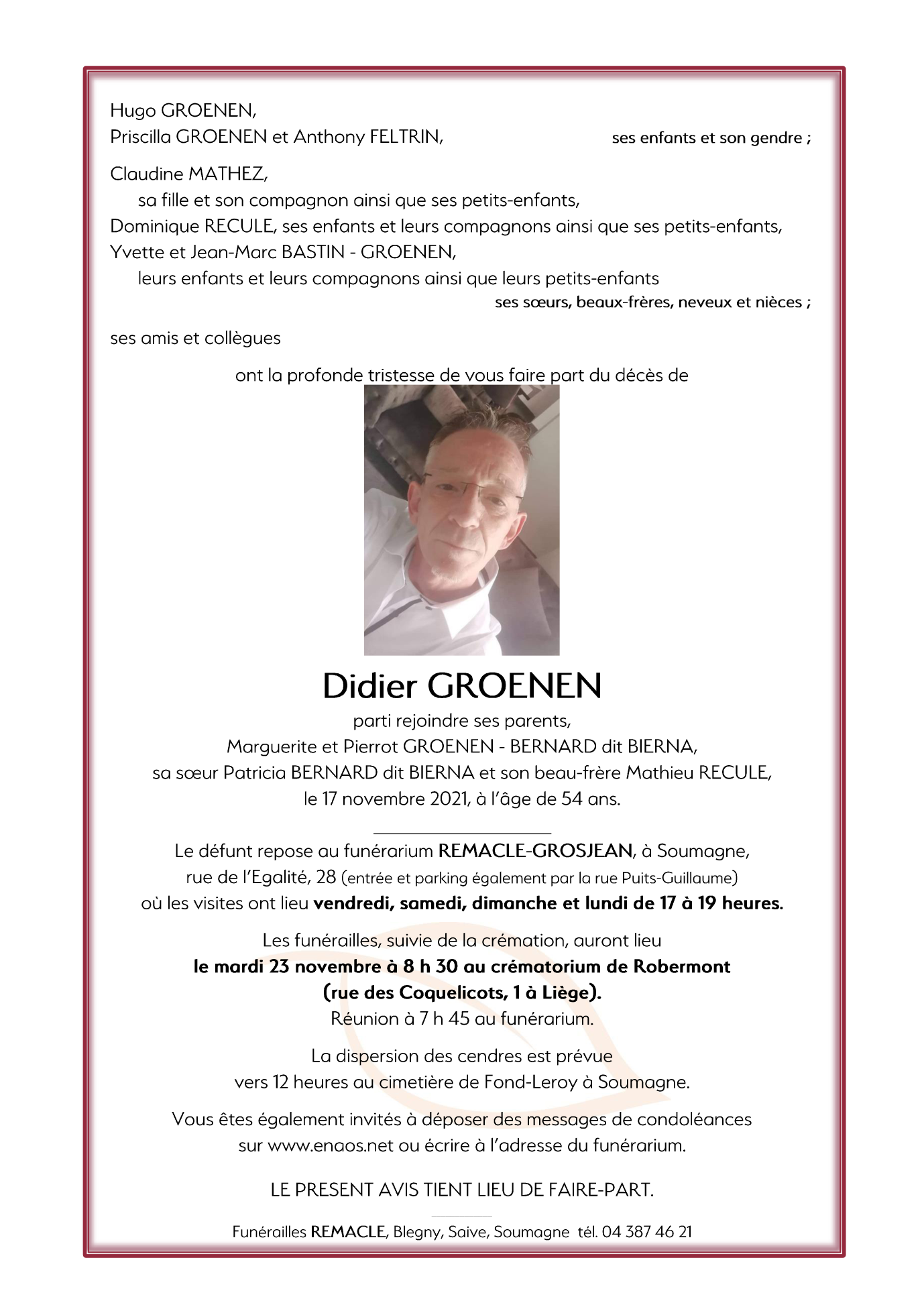 Décédé à Liège (4000) le mercredi 17 novembre 2021 à l'âge de 54 ans
