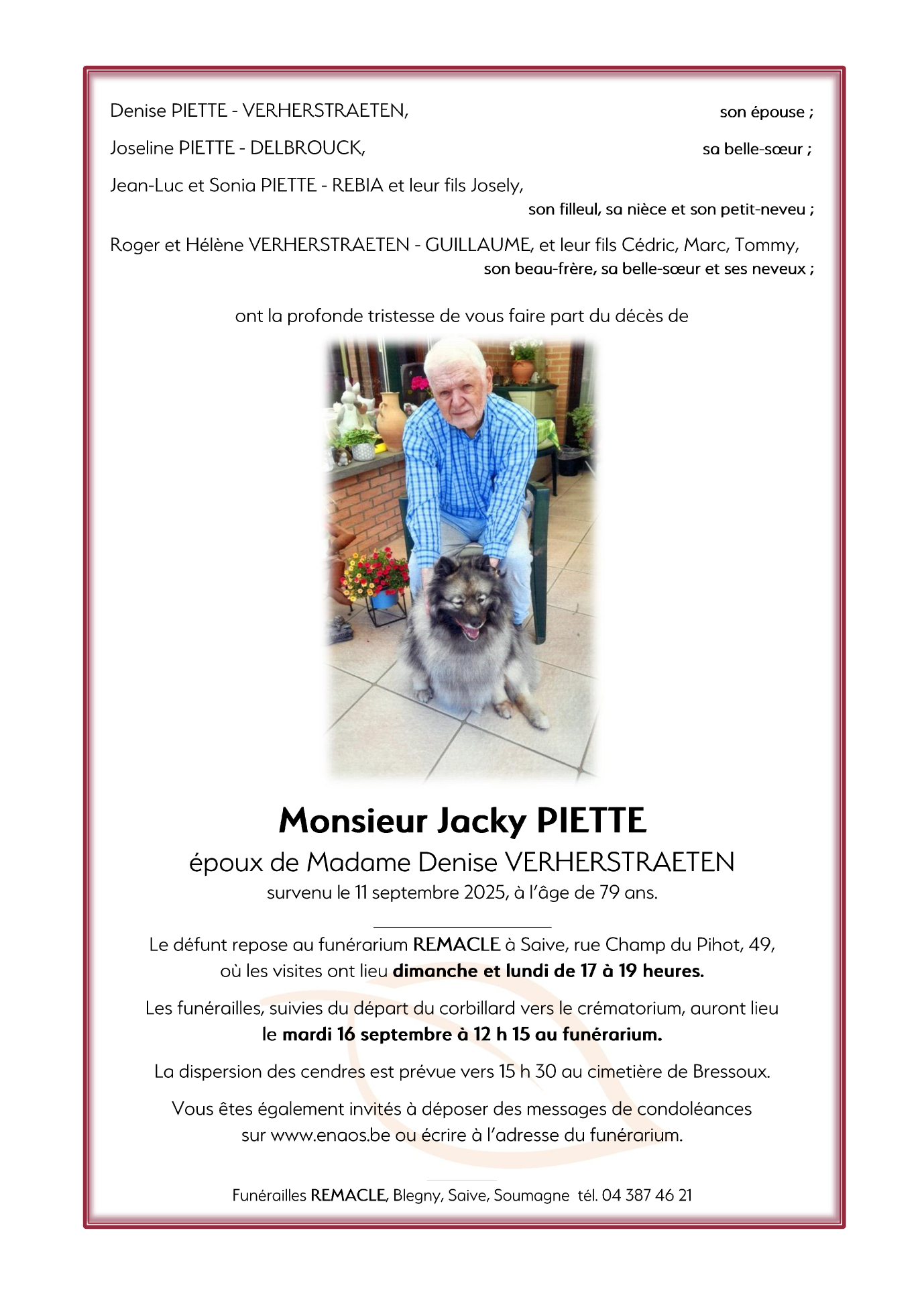 Décédé à Herstal (4040) le jeudi 11 septembre 2025 à l'âge de 79 ans