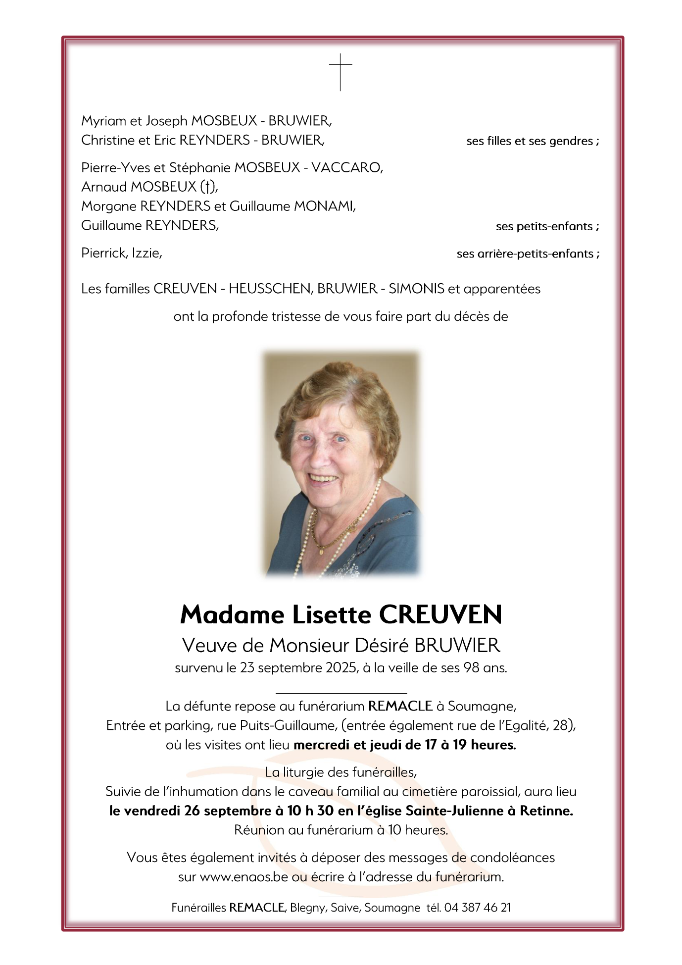 Décédée à Blegny (4670) le mardi 23 septembre 2025 à l'âge de 97 ans