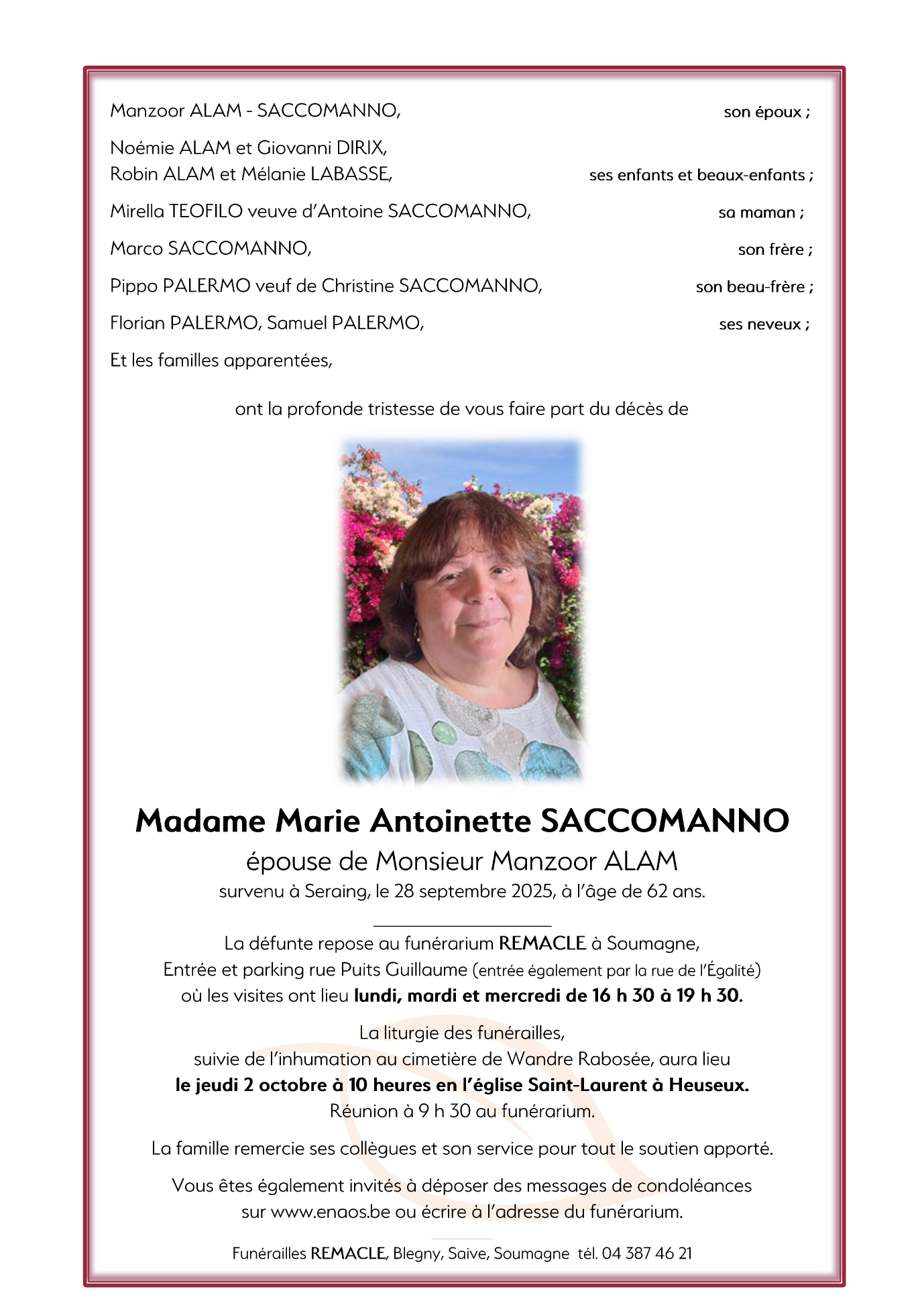 Décédée à Seraing (4100) le dimanche 28 septembre 2025 à l'âge de 62 ans