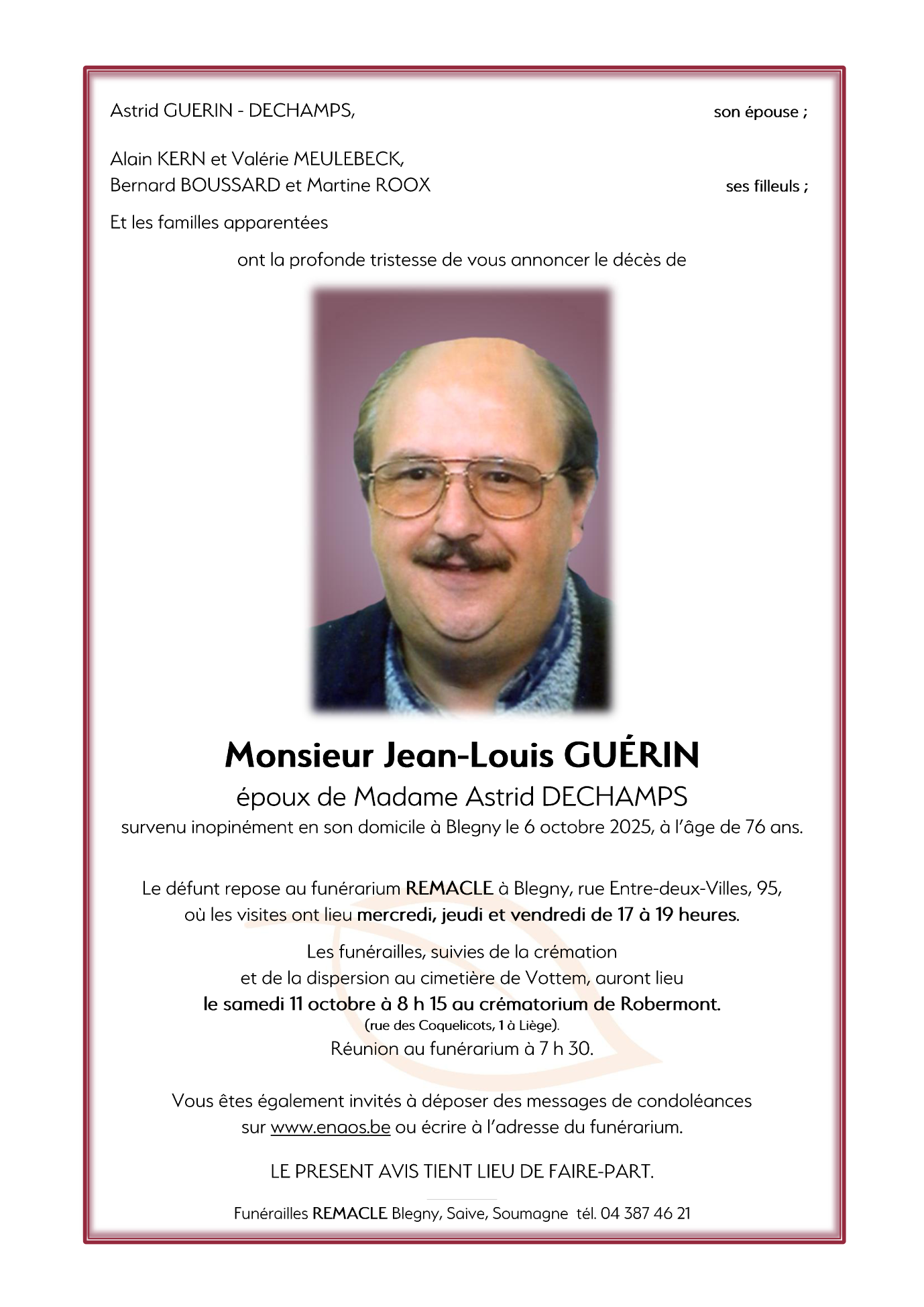 Décédé à Blegny (4670) le lundi 6 octobre 2025 à l'âge de 76 ans