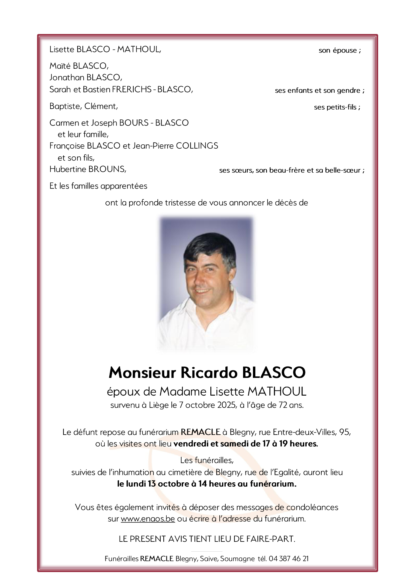 Décédé à Liège (4000) le mardi 7 octobre 2025 à l'âge de 72 ans