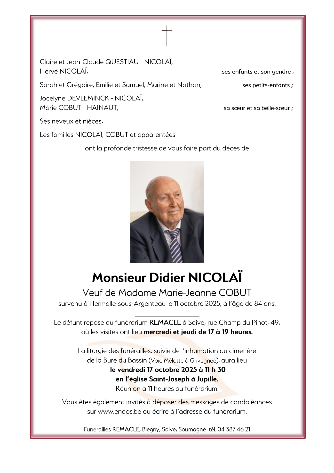 Décédé à Hermalle-sous-Argenteau (4681) le samedi 11 octobre 2025 à l'âge de 84 ans