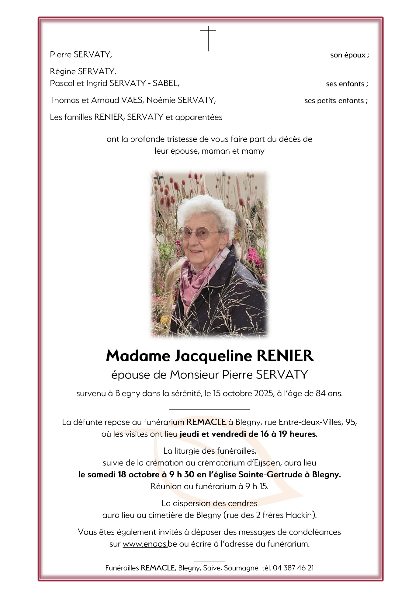 Décédée à Blegny (4670) le mercredi 15 octobre 2025 à l'âge de 84 ans