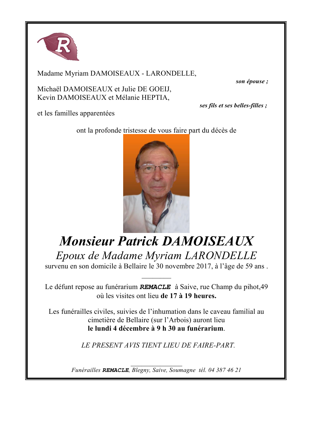Décédé à Beyne-Heusay (4610) le jeudi 30 novembre 2017 à l'âge de 59 ans