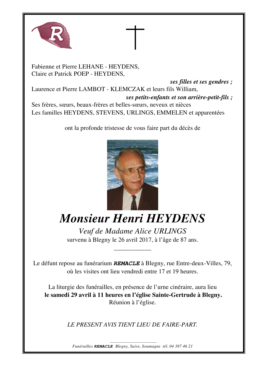Décédé à Blegny (4670) le mercredi 26 avril 2017 à l'âge de 87 ans
