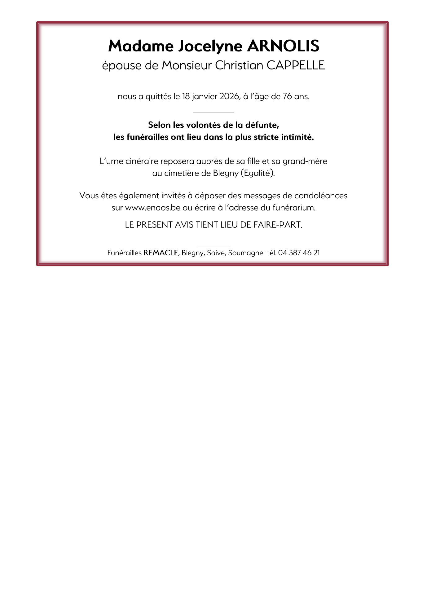Décédée à Blegny (4670) le dimanche 18 janvier 2026 à l'âge de 76 ans
