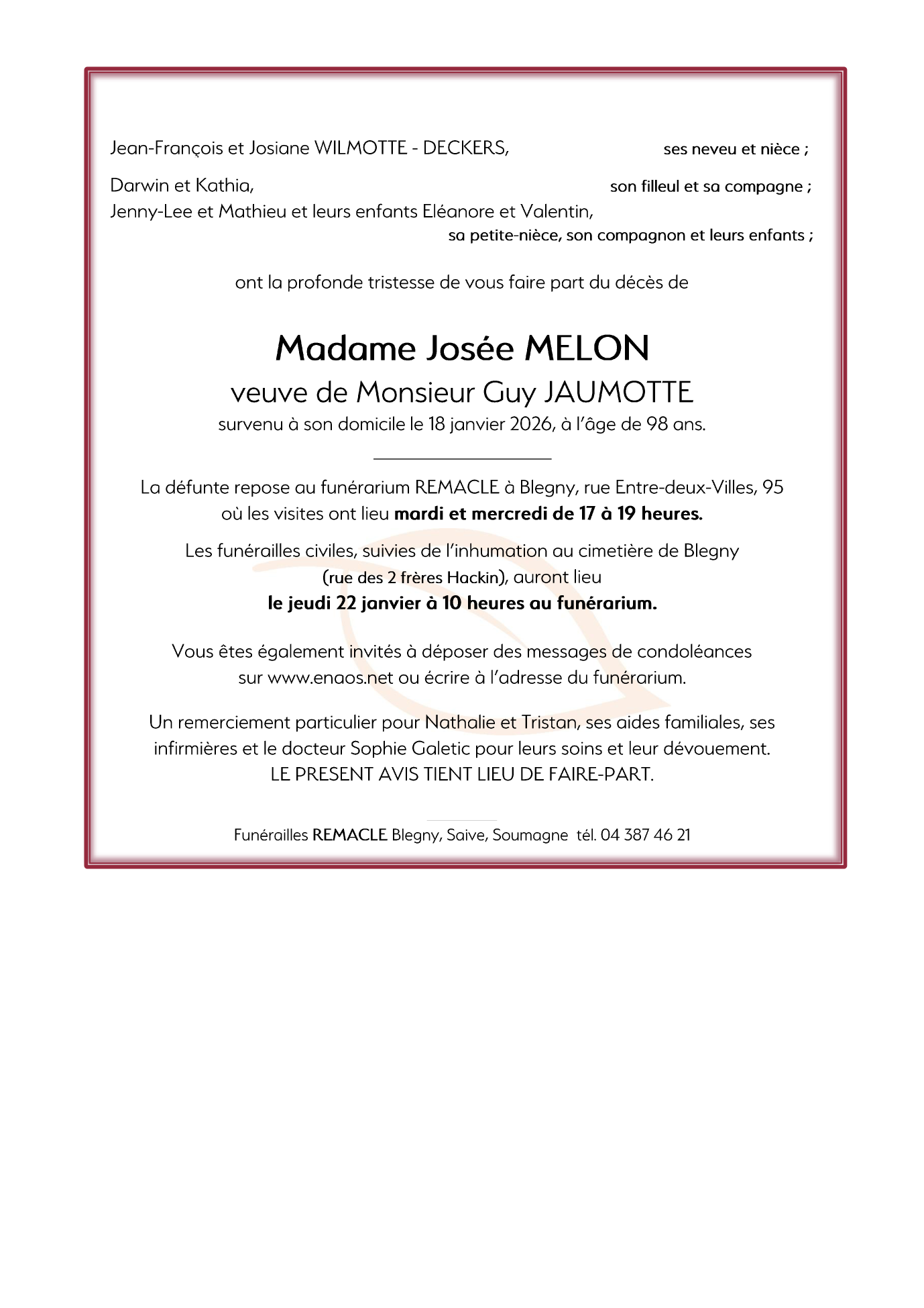 Veuve de Monsieur Guy JAUMOTTE