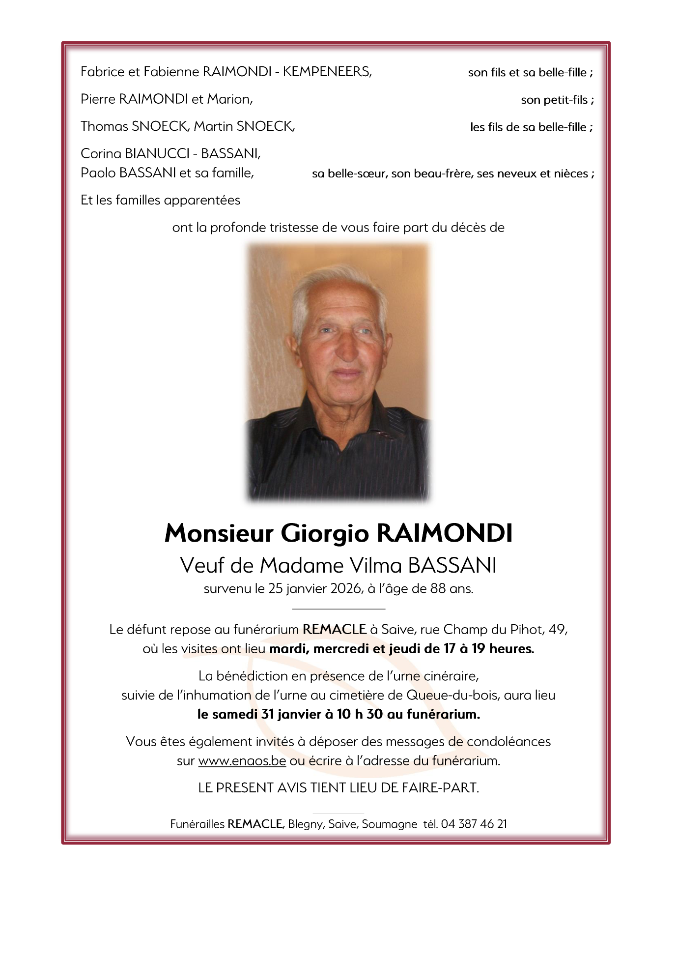 Décédé à Bois-de-Breux (4030) le dimanche 25 janvier 2026 à l'âge de 88 ans