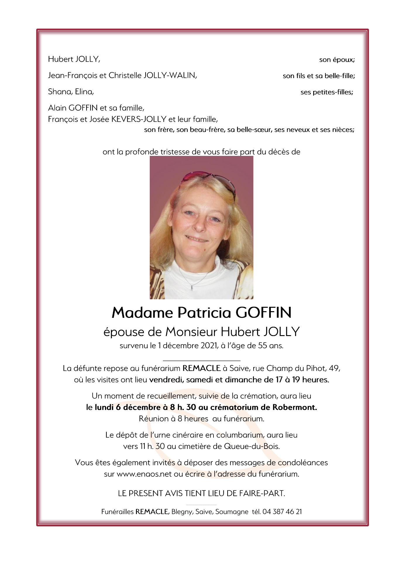Décédée à Saive (4671) le mercredi 1 décembre 2021 à l'âge de 55 ans