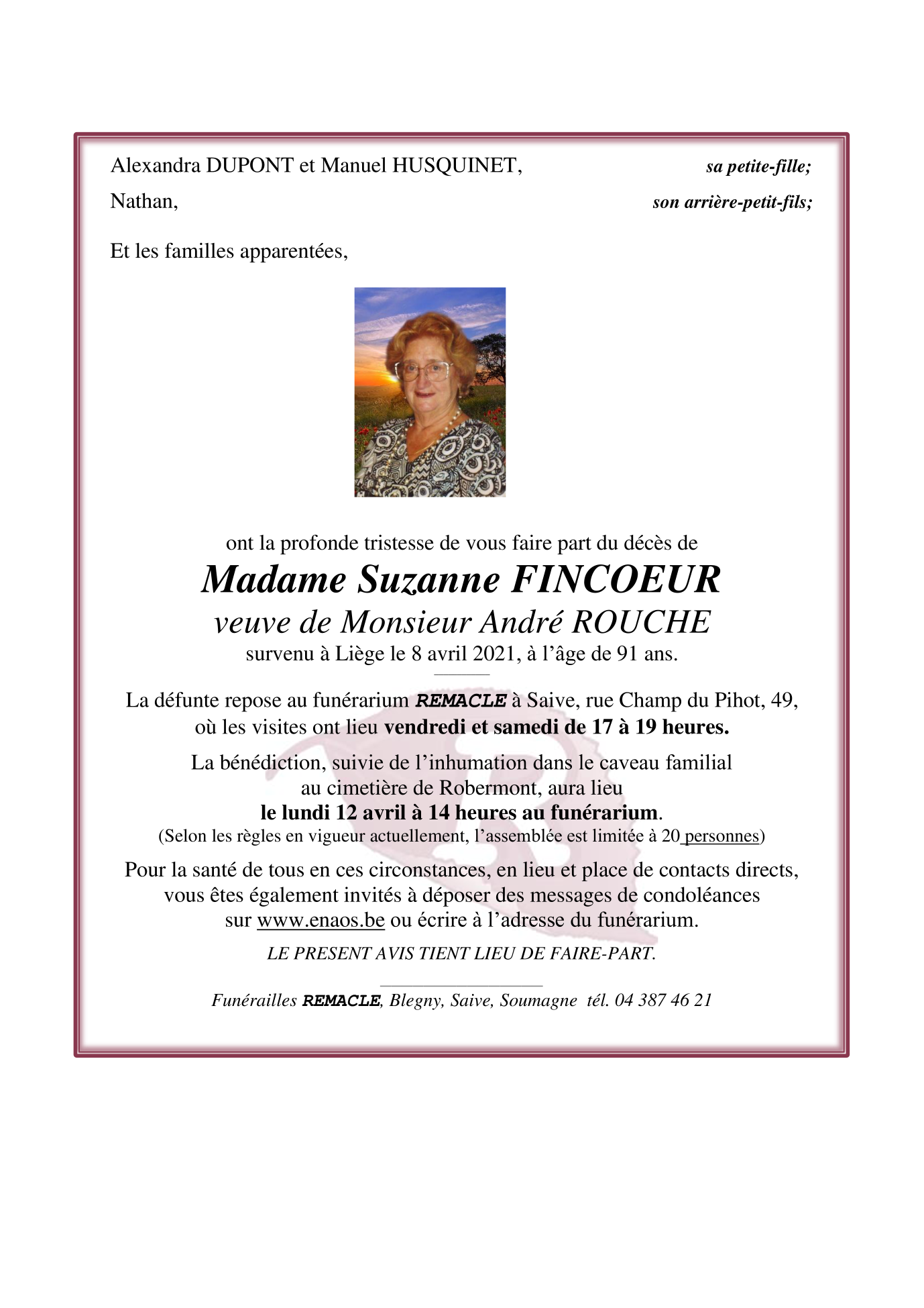 Décédée à Liège (4000) le jeudi 8 avril 2021 à l'âge de 91 ans