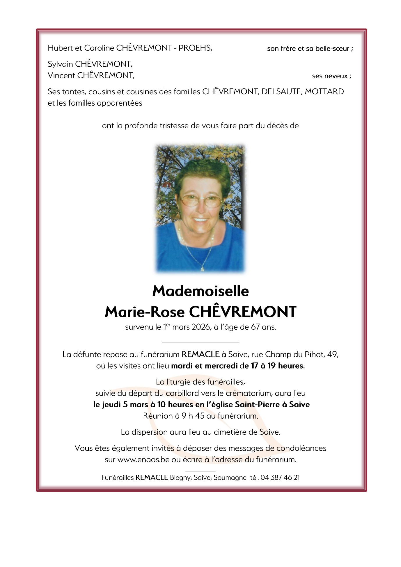 Décédée à Oupeye (4680) le dimanche 1 mars 2026 à l'âge de 67 ans