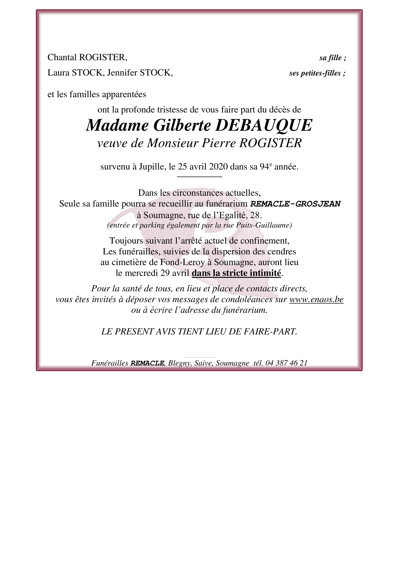 Veuve de Monsieur Pierre ROGISTER