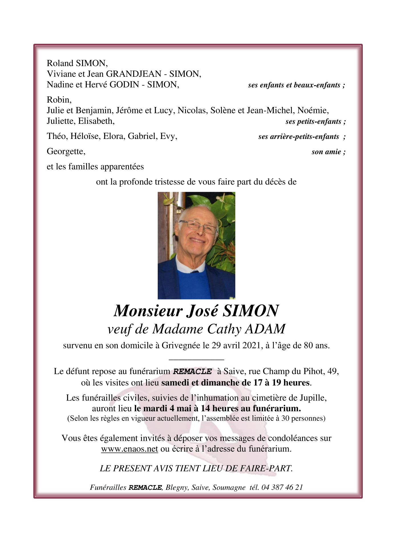 Décédé à Grivegnée (4030) le jeudi 29 avril 2021 à l'âge de 80 ans