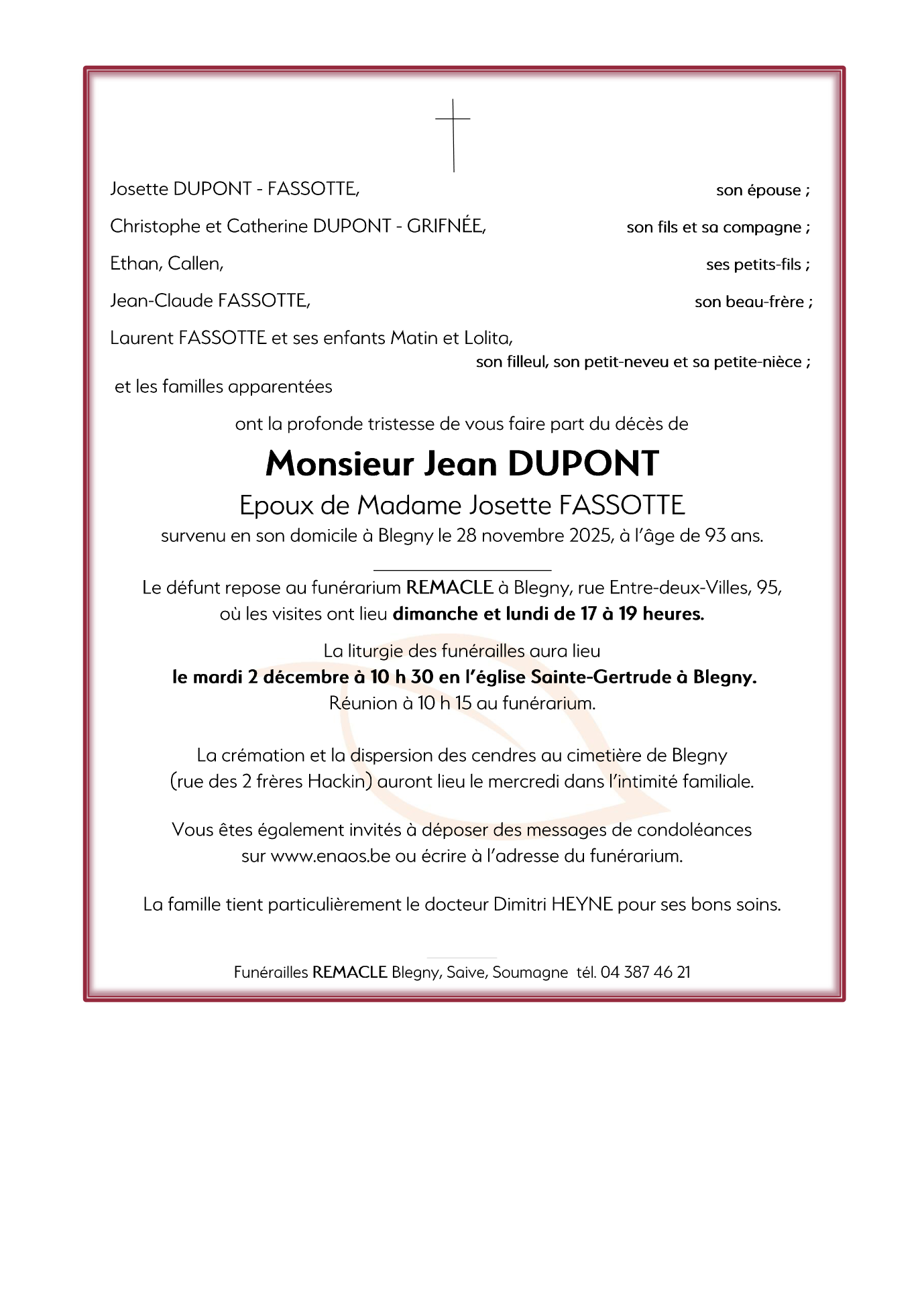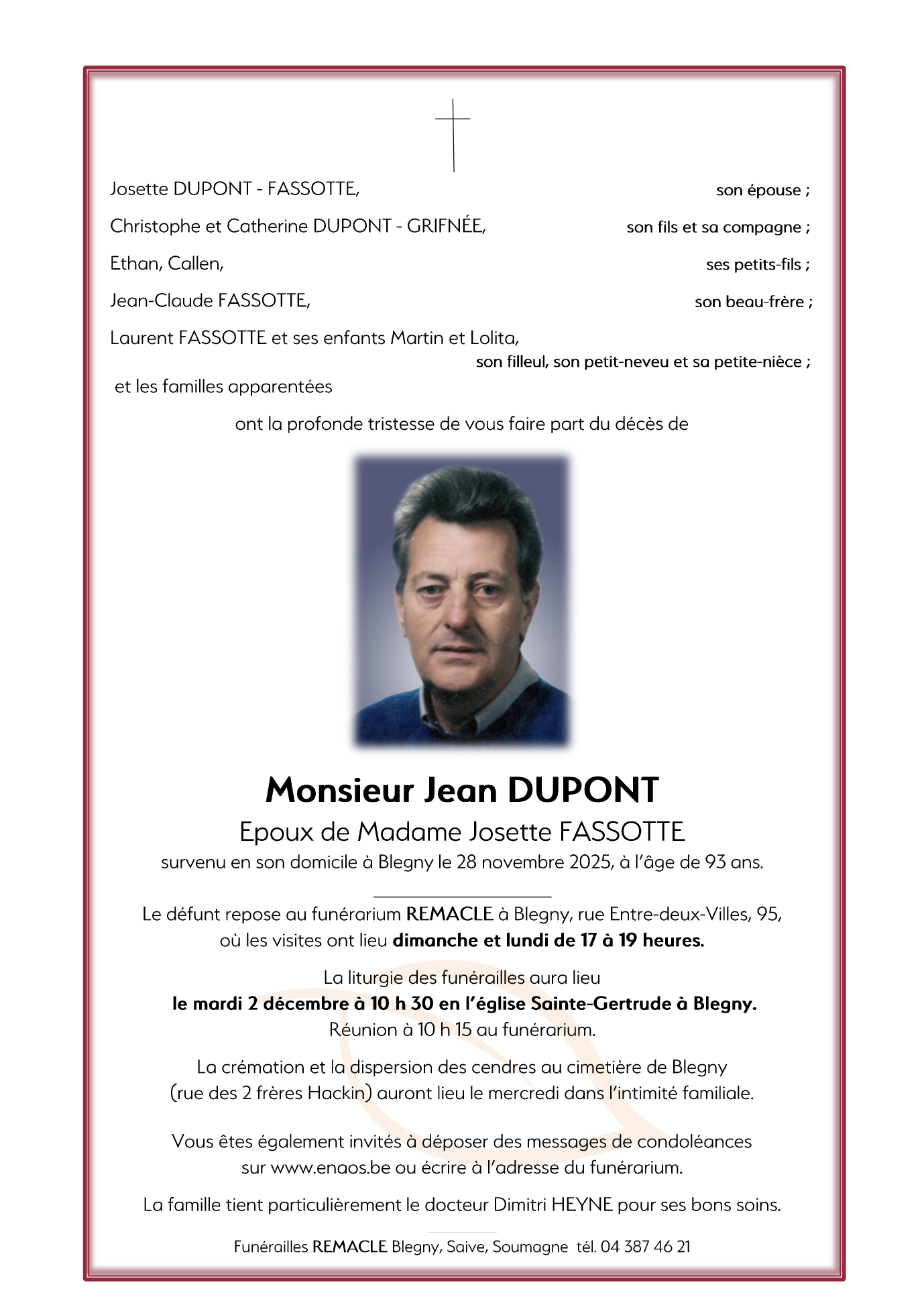 Décédé à Blegny (4670) le vendredi 28 novembre 2025 à l'âge de 93 ans