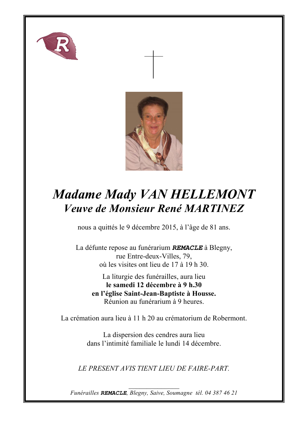 Décédée à Housse (4671) le mercredi 9 décembre 2015 à l'âge de 81 ans