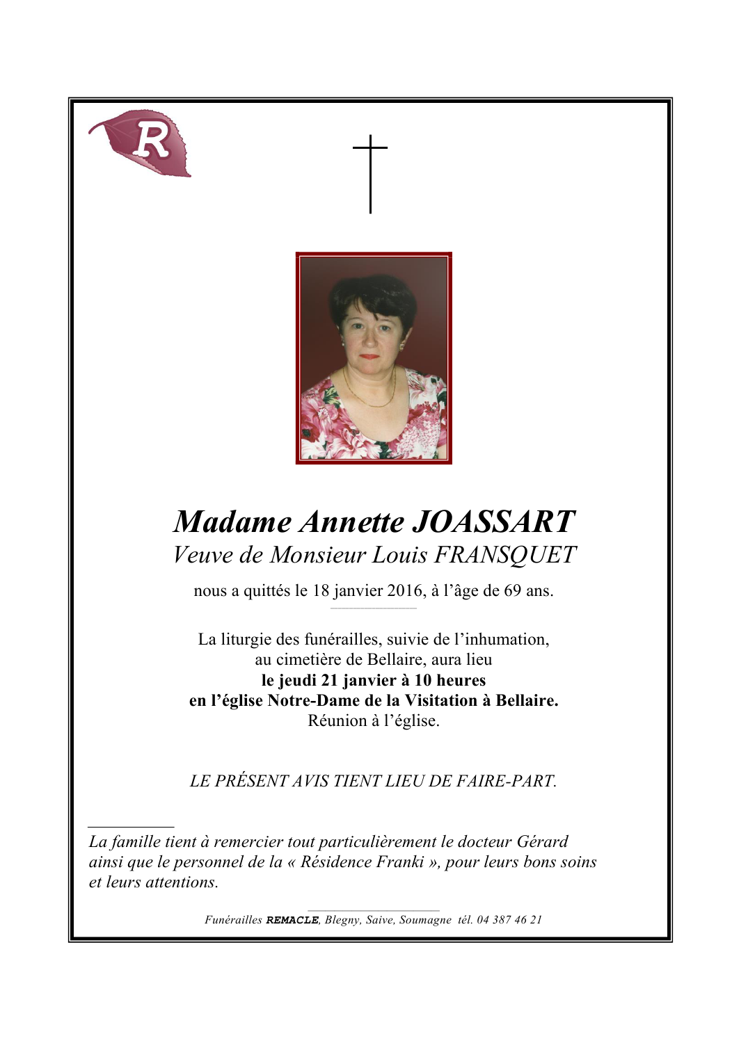 Décédée à Liège (4000) le lundi 18 janvier 2016 à l'âge de 69 ans