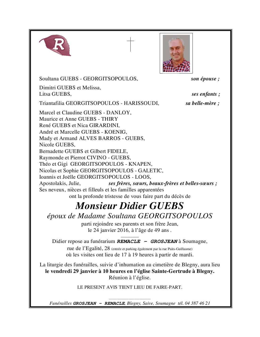 Décédé à Aywaille (4920) le dimanche 24 janvier 2016 à l'âge de 49 ans