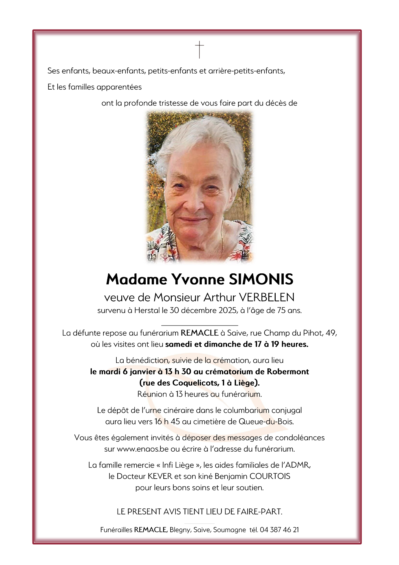 Décédée à Herstal (4040) le mardi 30 décembre 2025 à l'âge de 75 ans