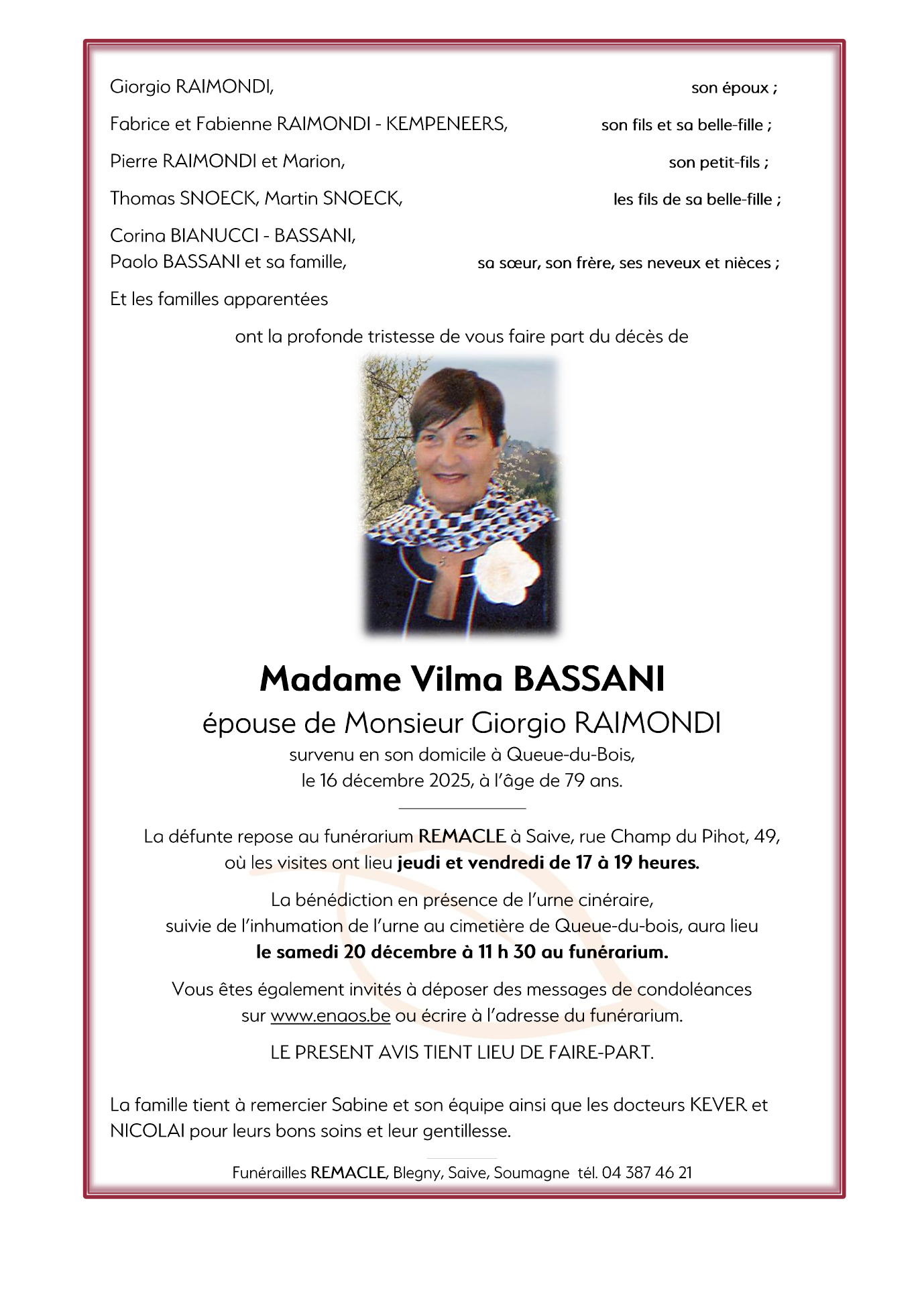 Décédée à Queue-du-Bois (4610) le mardi 16 décembre 2025 à l'âge de 79 ans