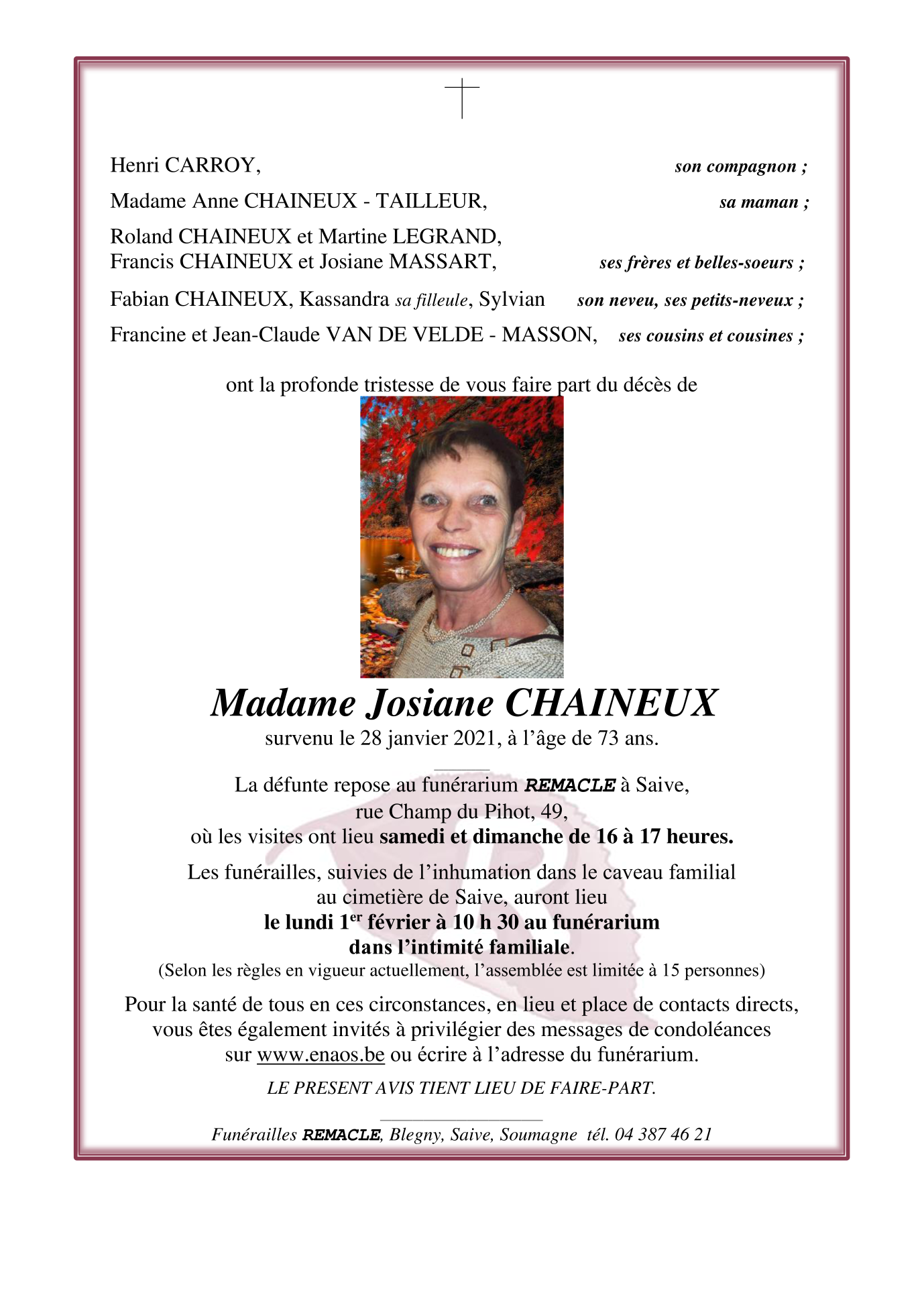 Décédée à Herstal (4040) le jeudi 28 janvier 2021 à l'âge de 73 ans