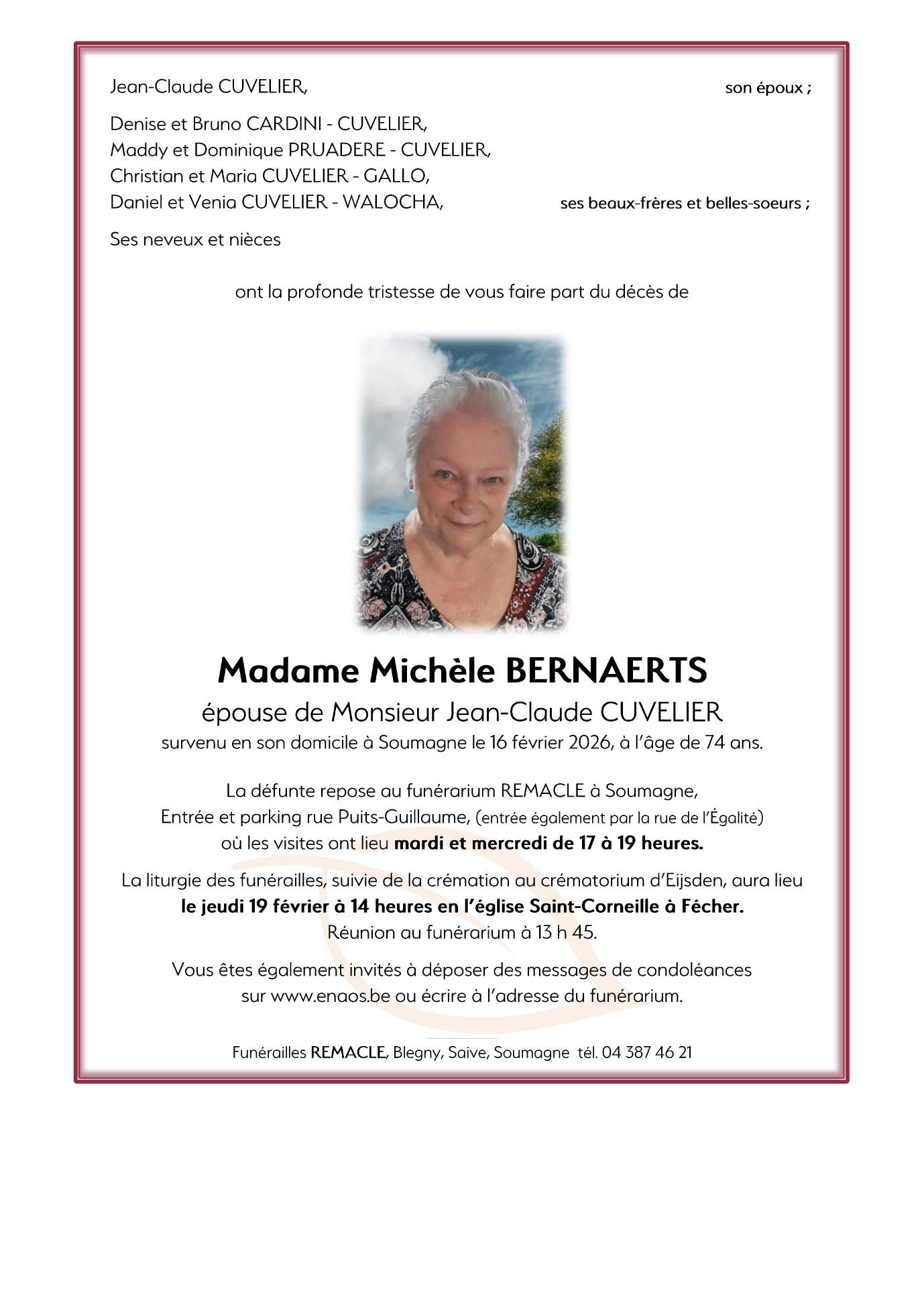Décédée à Soumagne (4630) le lundi 16 février 2026 à l'âge de 74 ans