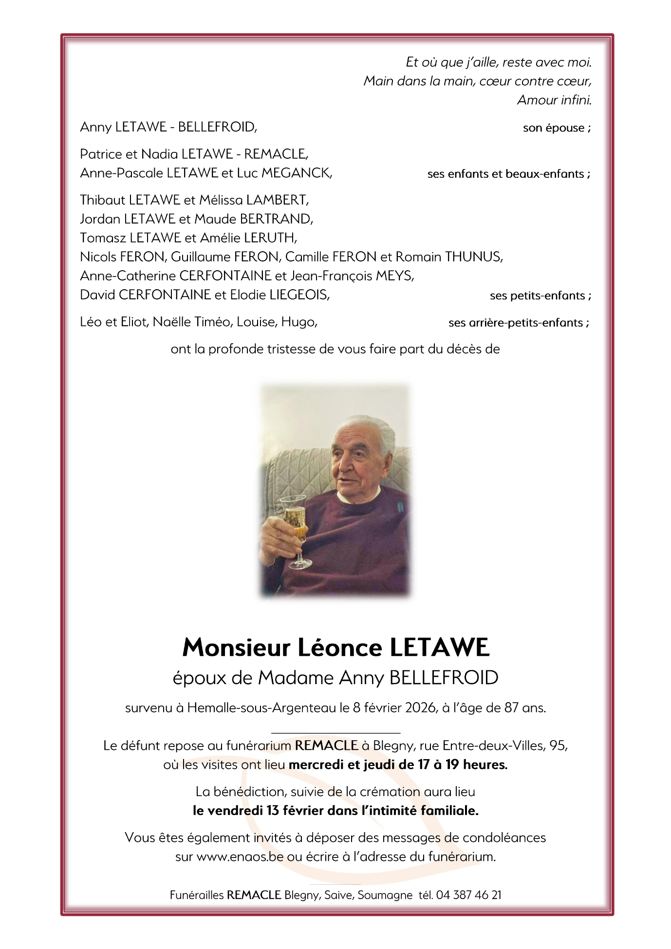 Décédé à Hermalle-sous-Argenteau (4681) le dimanche 8 février 2026 à l'âge de 87 ans