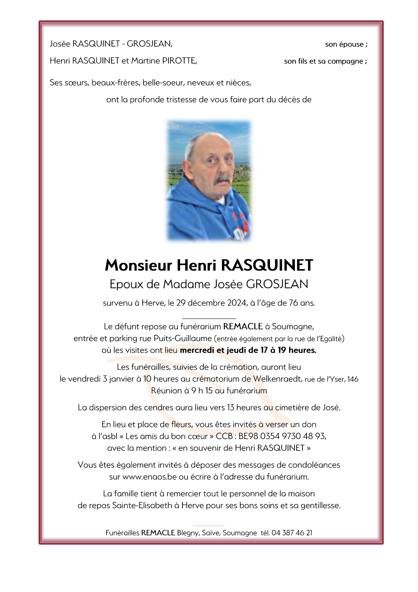 Décédé à Herve (4650) le dimanche 29 décembre 2024 à l'âge de 76 ans