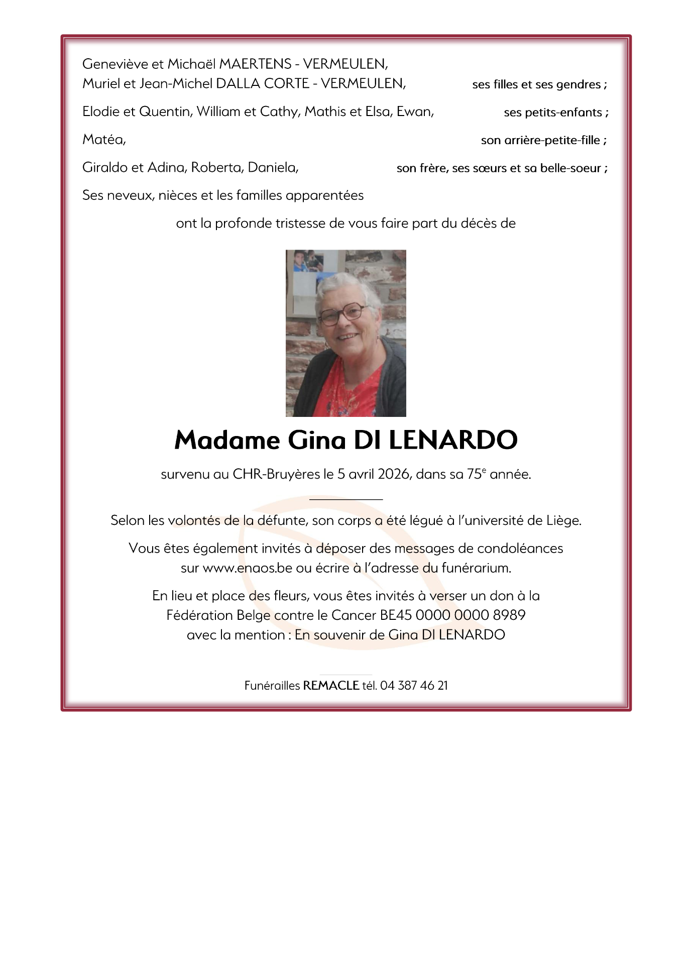 Décédée à Bois-de-Breux (4030) le dimanche 5 avril 2026 à l'âge de 74 ans