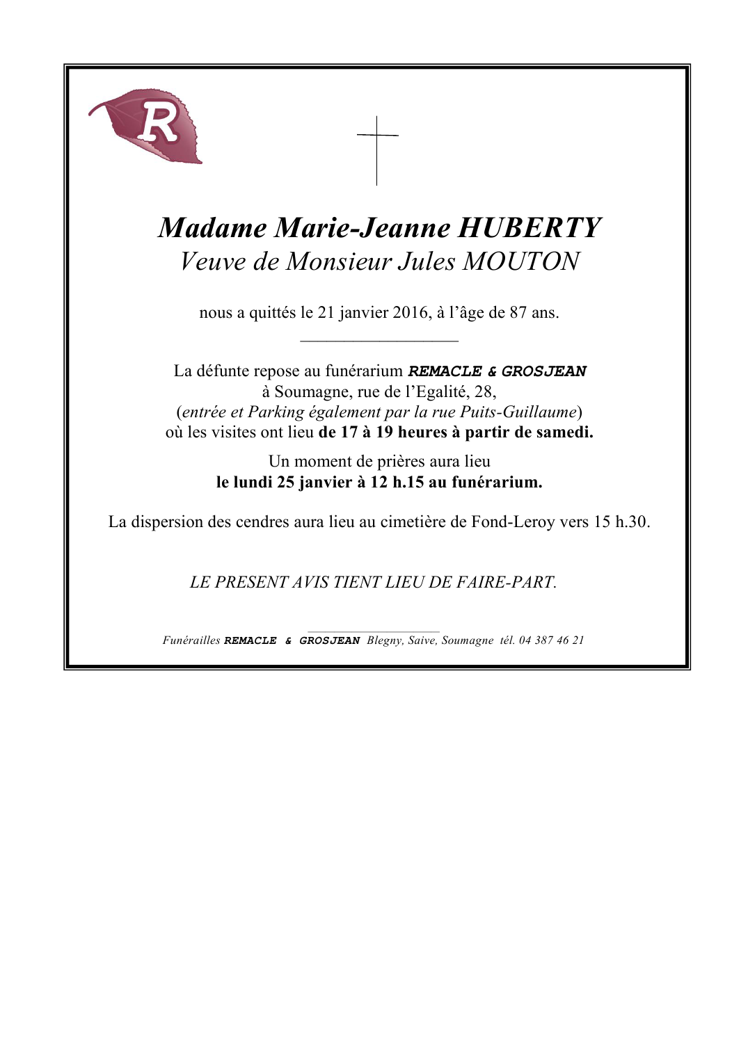 Décédée à Soumagne (4630) le jeudi 21 janvier 2016 à l'âge de 87 ans