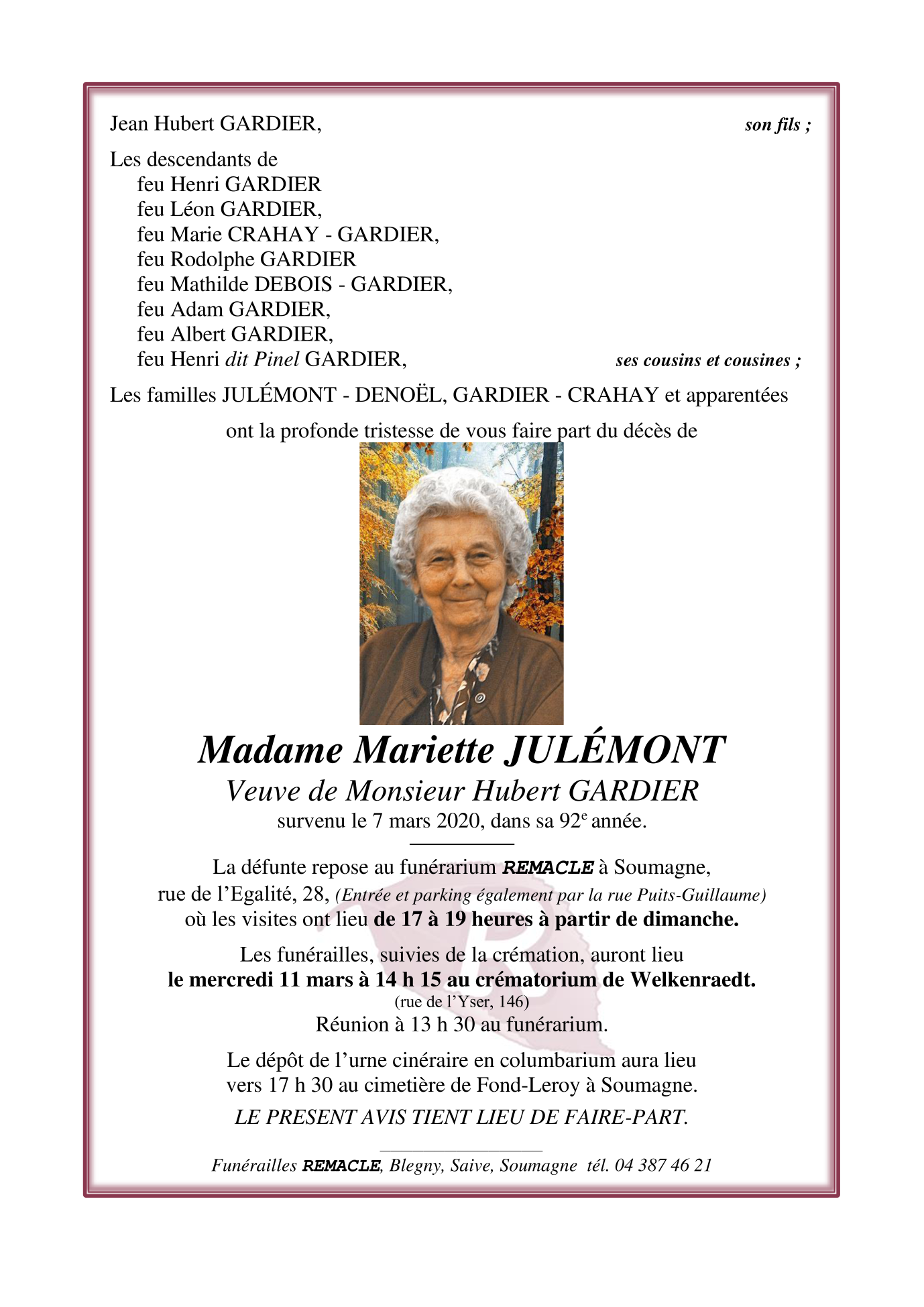 Décédée à Soumagne (4630) le samedi 7 mars 2020 à l'âge de 91 ans