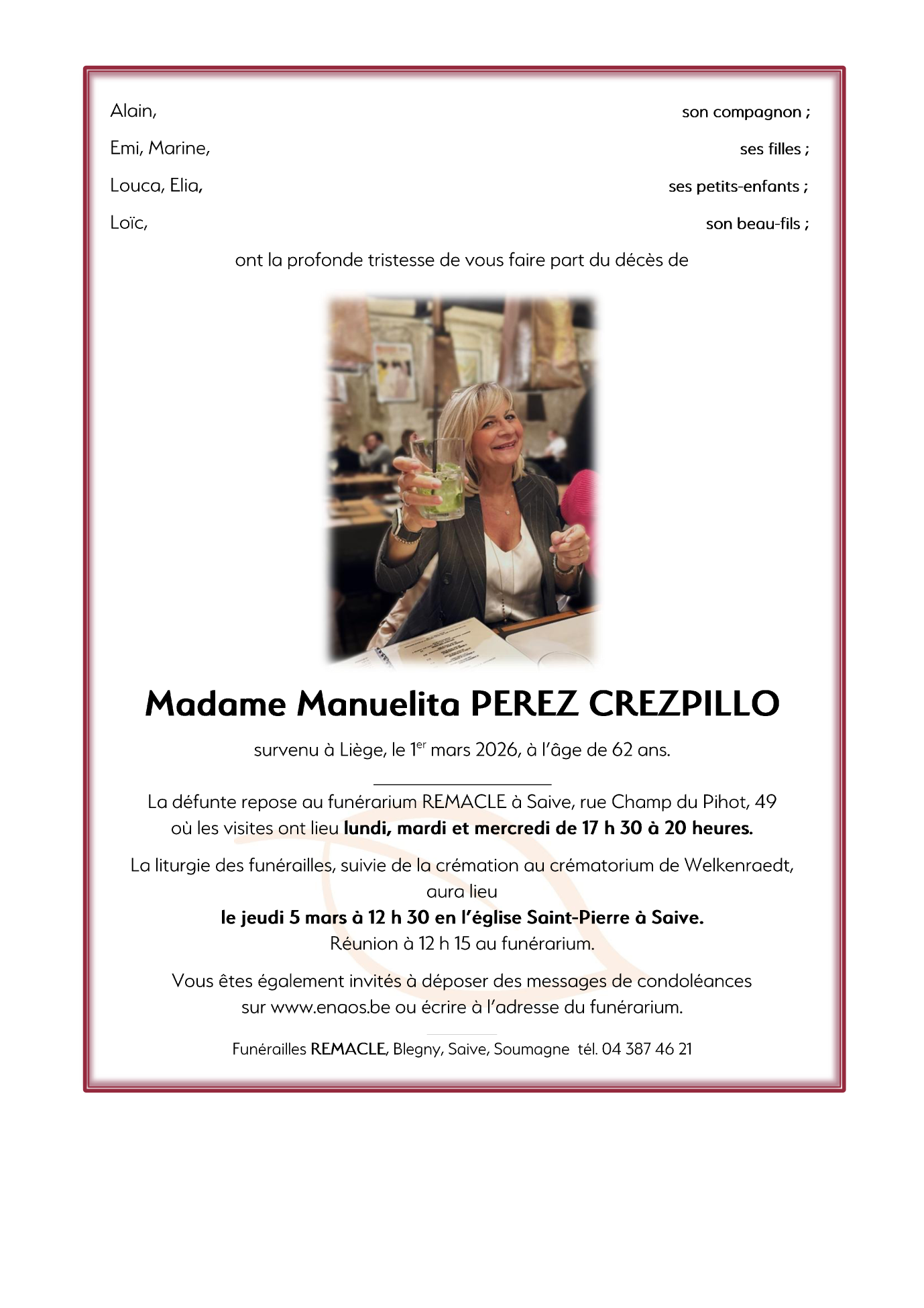 Décédée à Liège le dimanche 1 mars 2026 à l'âge de 62 ans
