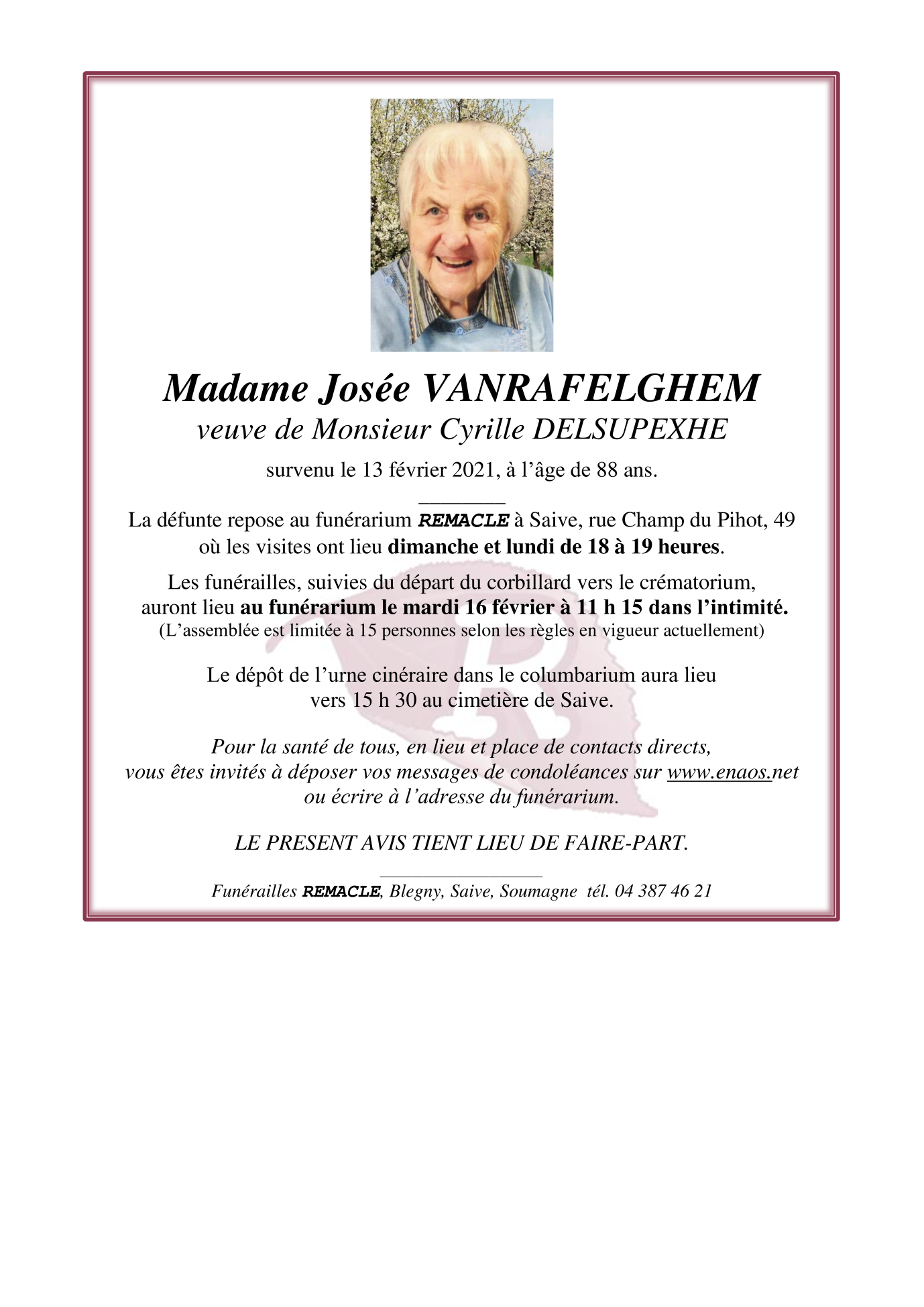 Décédée à Soumagne (4630) le samedi 13 février 2021 à l'âge de 88 ans