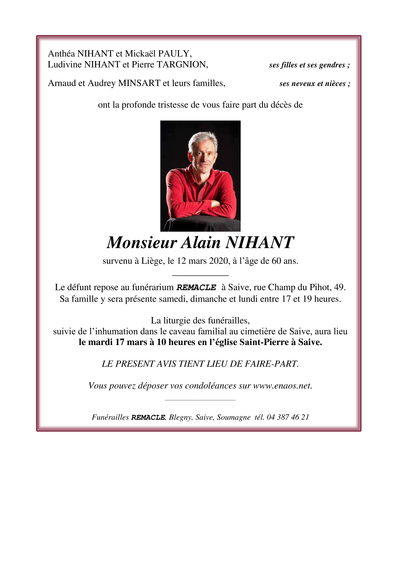 Décédé à Liège (4000) le jeudi 12 mars 2020 à l'âge de 60 ans