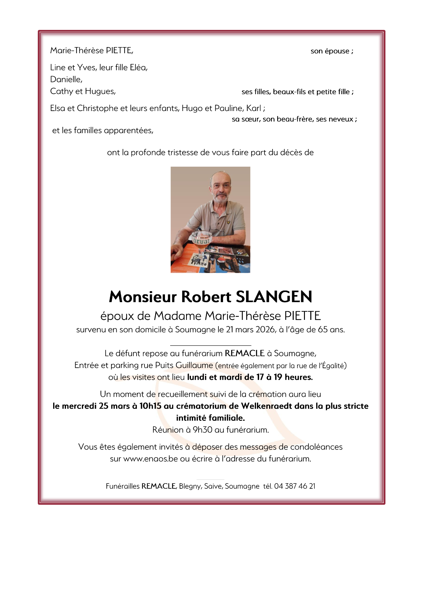 Décédé à Soumagne (4630) le samedi 21 mars 2026 à l'âge de 65 ans