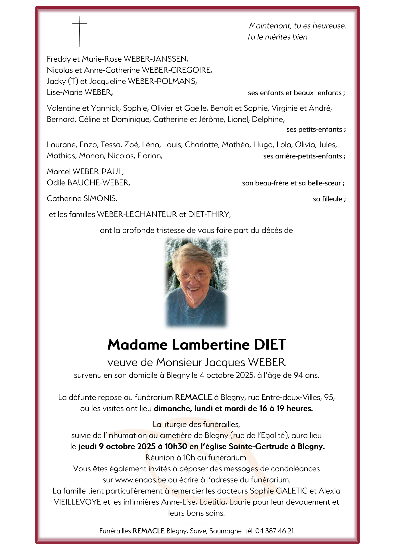 Décédée à Blegny (4670, Belgique) le samedi 4 octobre 2025 à l'âge de 94 ans